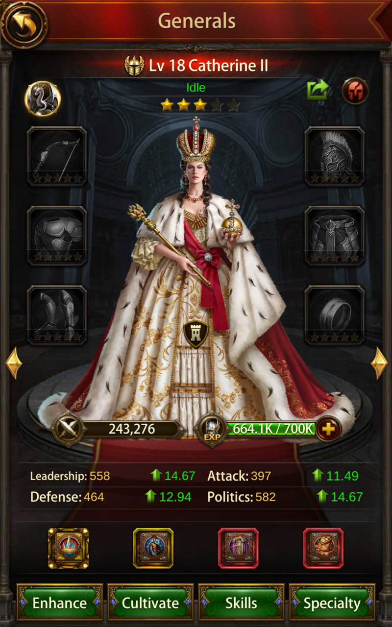 To be clear: I am NOT recommending using Catherine II as a peace time mayor. I am recommending that, if you can ascend her, she be used as a PvP mayor. There are a other generals that, like her, appear on the surface to be peace time mayors, but have hidden PvP potential. The reader will need to evaluate these mayors as and against other PvP mayors on the strength of these PvP buffs.