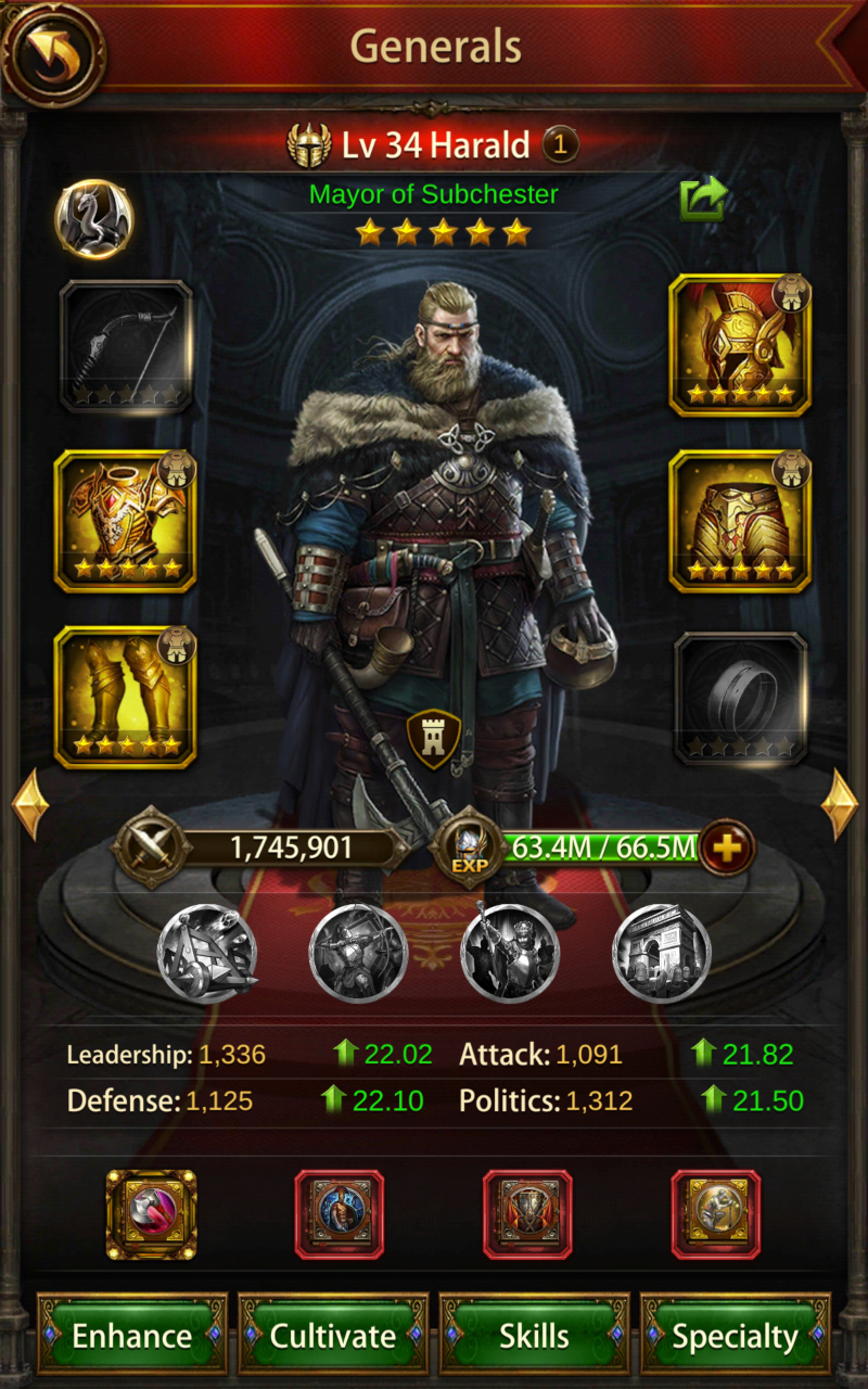 Both mayors have been put on the same subcity in turn. Mayor number 1, Catherine, results in an average training speed of +329.79% while mayor number 2, Harald, results in an average speed of +441.2%. Thus, despite Catherine’s special skill, Domination, giving her a training speed boost of 35% to Harald’s 25% Level 4 Training Speed skill book, he is able to train troops faster.